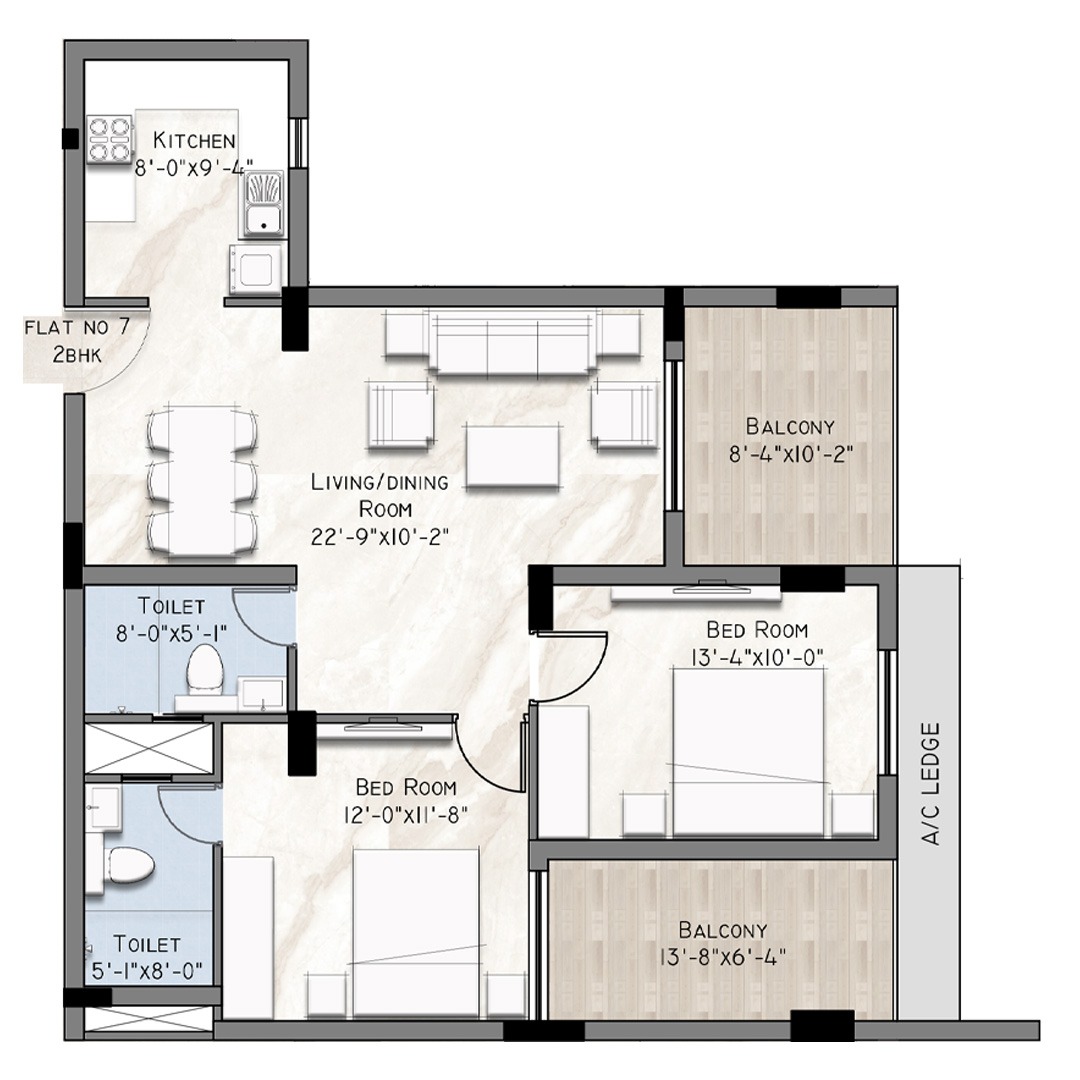 Fully covered RCC Structure with raft foundation and laterite masonry for external walls and solid block masonry for internal walls.